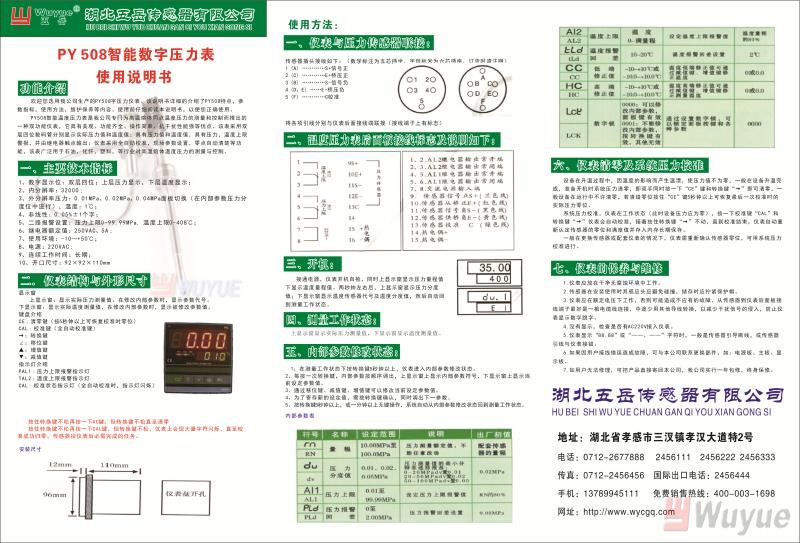 歡迎您選用湖北五岳傳感器有限公司生產(chǎn)的PY508/PY1508智能數(shù)字壓力儀表。該說明書詳細(xì)的介紹了PY508/PY1508的性能特點(diǎn),參數(shù)指標(biāo),使用方法,維護(hù)保養(yǎng)等內(nèi)容。使用前仔細(xì)閱讀本說明書,以便您正確使用。