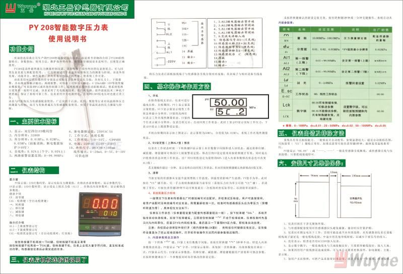 歡迎您選用湖北五岳傳感器有限公司生產(chǎn)的PY208/PY808智能數(shù)字壓力儀表。該說明書詳細(xì)的介紹了PY208/PY808的性能特點(diǎn),參數(shù)指標(biāo),使用方法,維護(hù)保養(yǎng)等內(nèi)容。使用前仔細(xì)閱讀本說明書,以便您正確使用。